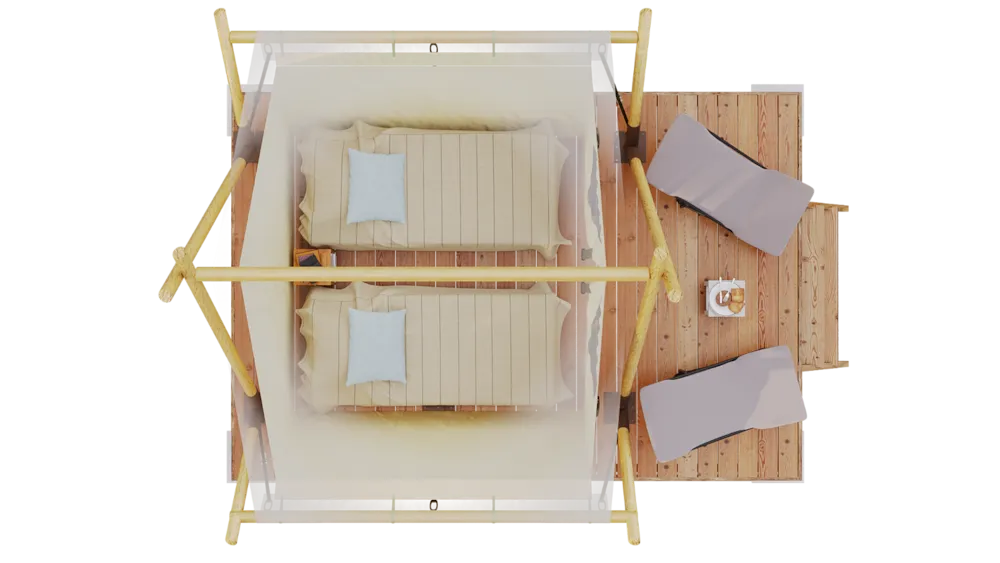 Tente ossature bois montée sur pilotis avec escalier de 10 marches, surface de 11,17m2, panneau solaires, hauteur sous tente de 18 cm à 2m
